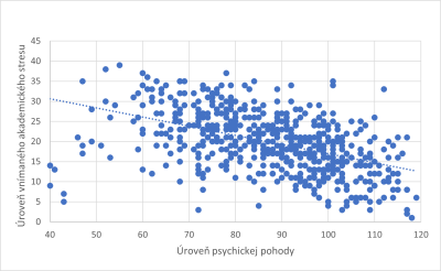 Graf 1: Vzťah medzi vnímaným akademickým stresom a psychickou pohodou vysokoškolských študentov